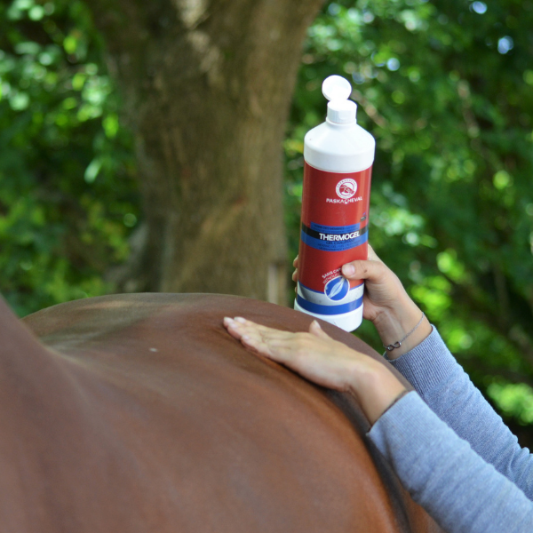 Thermogel is een verwarmende gel die op de benen en spieren aangebracht kan worden ter voorbereiding op de training. Vooral in de winter zorgt Thermogel ervoor dat door de warmte de bloedcirculatie wordt gestimuleerd. Daardoor kunnen de spieren zich makkelijker ontspannen. Thermogel kan ook na de trainining worden gebruikt om je paard te masseren op gevoelige plekken. Zo draagt het ook bij aan het herstel van de spieren na intensieve trainingen.