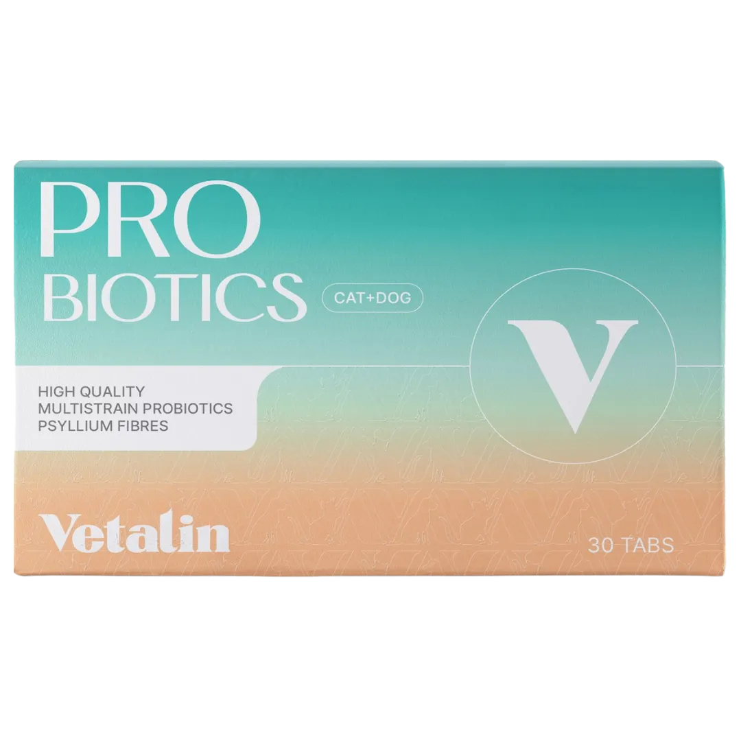 Zeer hoogwaardig probiotica voor honden en katten. Als smakelijk kauwtablet te geven. Vetalin Probiotics bevat de volgende probiotica stammen (Lactobacillus Acidophilus, Lactobacillus Paracasei, Lactobacillus Plantarum, Bifidobacterium Animalis spp. Lactis). Verder verrijkt met prebiotica en Psylliumvezels.Ā