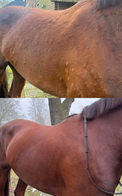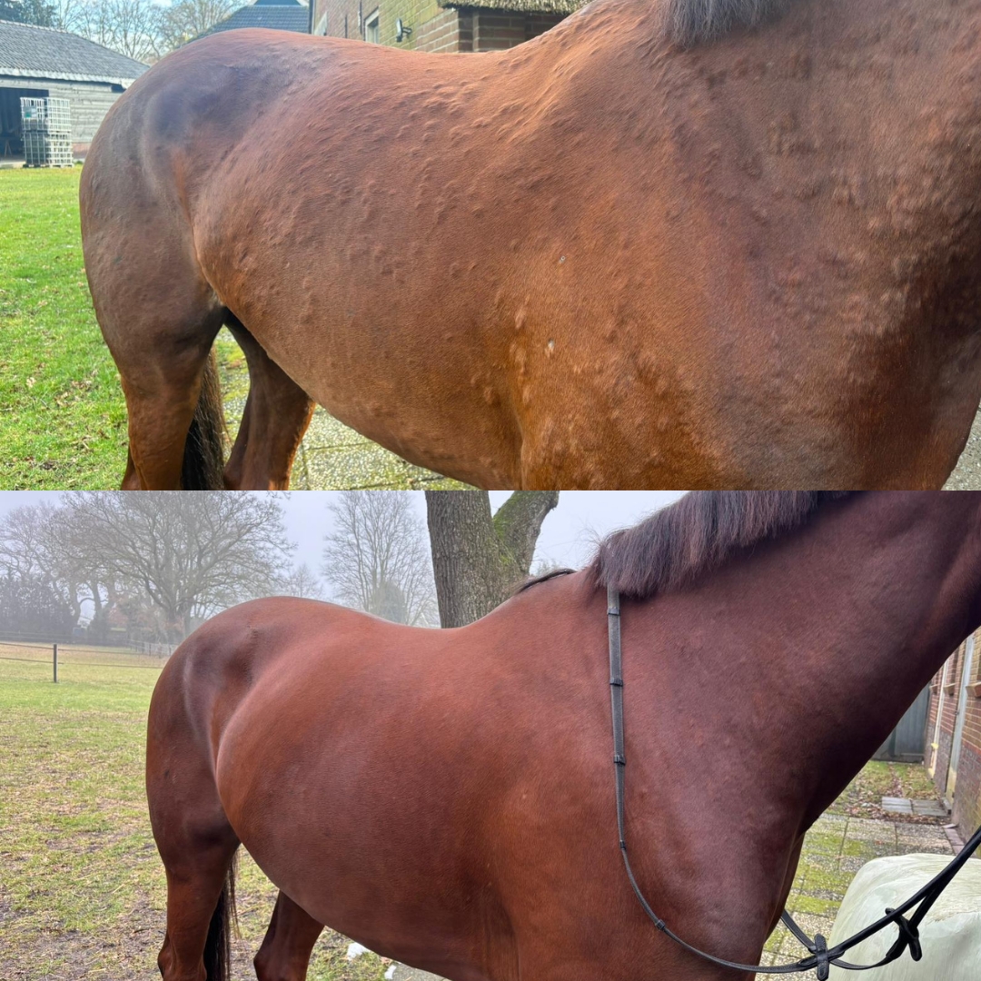 In januari 2025 kreeg mijn merrie voor het eerst bulten. Dit werd door de kliniek in eerste instantie gezien als een allergische reactie. Daarna zijn we een traject ingegaan met meerdere allergietesten en bloedonderzoeken, maar er is nooit duidelijk geworden wat de oorzaak van de bulten was. We zijn destijds voor een second opinion naar een tweede kliniek gegaan. Medicatie gaf geen blijvende verandering in de bulten, al leek het soms tijdelijk verschil te maken. In die periode is mijn merrie erg ziek geweest, at slecht en viel veel af. Uiteindelijk hebben we haar weer wat zien opknappen met probiotica en vitaminesupplementen, maar de bulten bleven af en toe terugkomen. Ze kreeg de diagnose netelroos en leek daarnaast gevoelig te reageren op invloeden van binnenuit. Een duidelijke oorzaak is nooit vastgesteld.